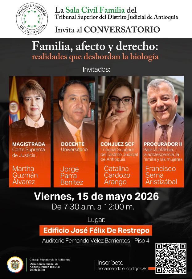 La Sala Civil Familia del Tribunal Superior del Distrito Judicial de Antioquia extiende una cordial invitación a todos los profesionales, académicos y estudiantes del sector legal a participar en nuestro próximo conversatorio.