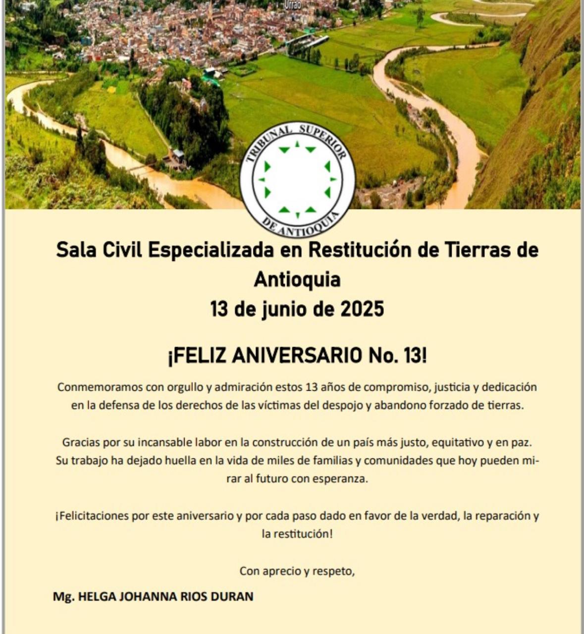El Tribunal Superior del Distrito Judicial de Antioquia felicita a la Sala Civil Especializada de Restitución de Tierras en su 13º aniversario