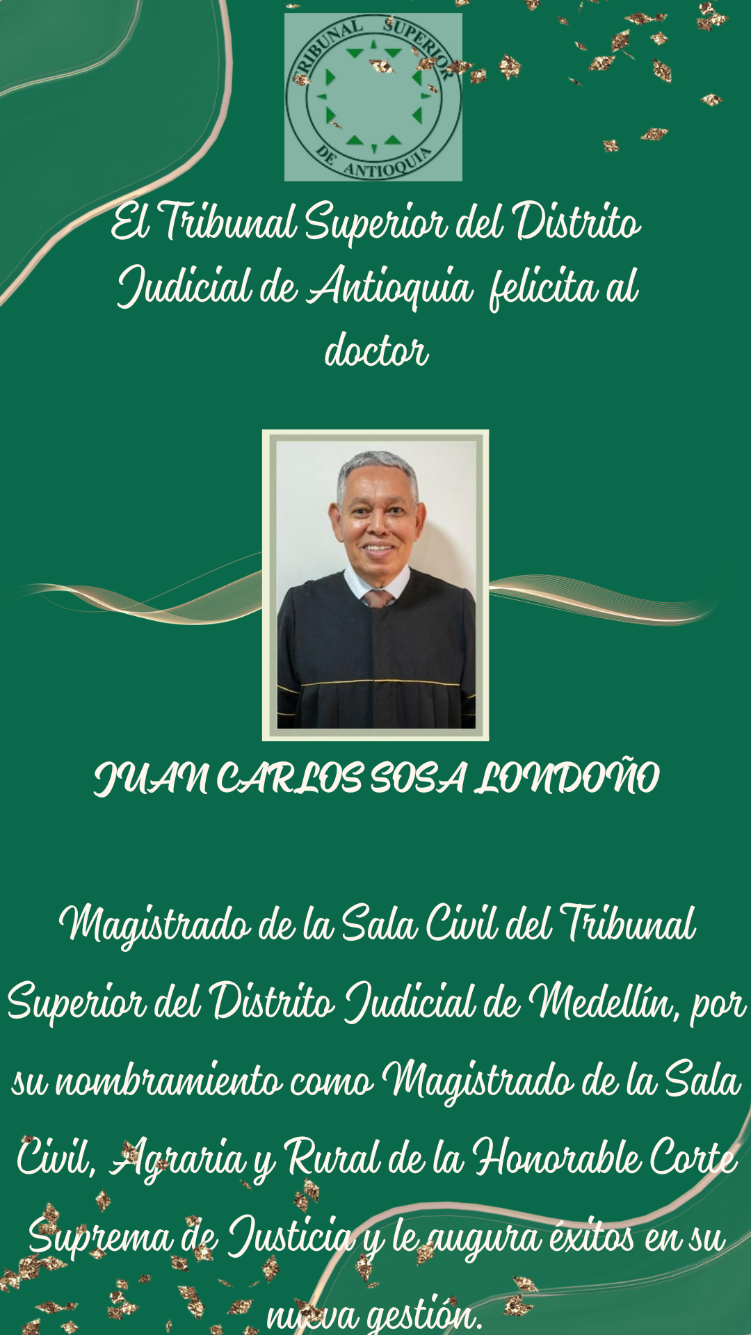 El Tribunal Superior del Distrito Judicial de Antioquia felicita al Dr. Juan Carlos Sosa Londoño por su designación como magistrado de la Sala Civil, Agraria y Rural de la Corte Suprema de Justicia.