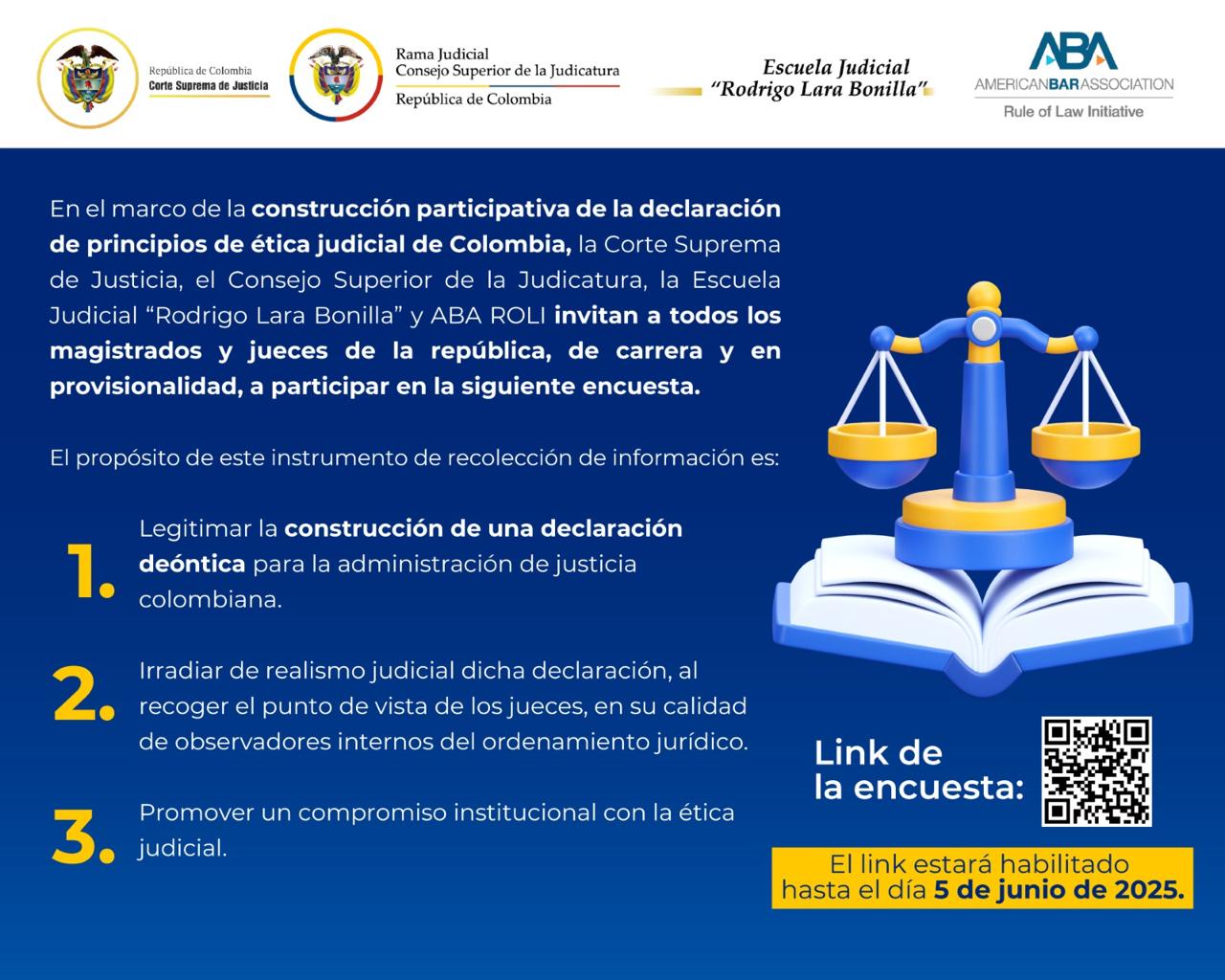 El Tribunal Superior del Distrito Judicial de Antioquia hace extensiva a todos los magistrados y jueces de la República la invitación formulada por la Corte Suprema de Justicia, el Consejo Superior de la Judicatura, la Escuela Judicial “Rodrigo Lara Bonilla” y ABA ROLI, para participar en la encuesta relacionada con la construcción participativa de la Declaración de Principios de Ética Judicial de Colombia.