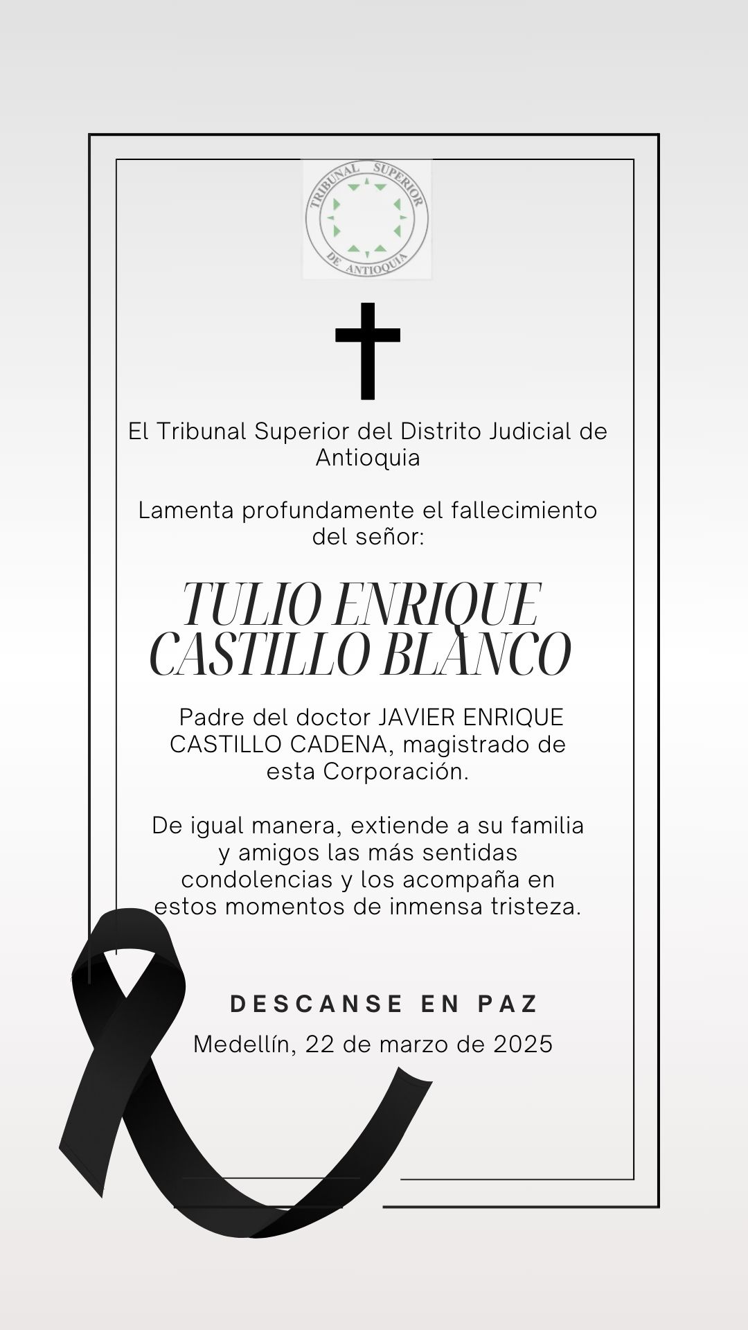 El Tribunal Superior del Distrito Judicial de Antioquia, lamenta profundamente el fallecimiento del señor TULIO ENRIQUE CASTILLO BLANCO, padre del doctor JAVIER ENRIQUE CASTILLO CADENA, magistrado de esta Corporación.