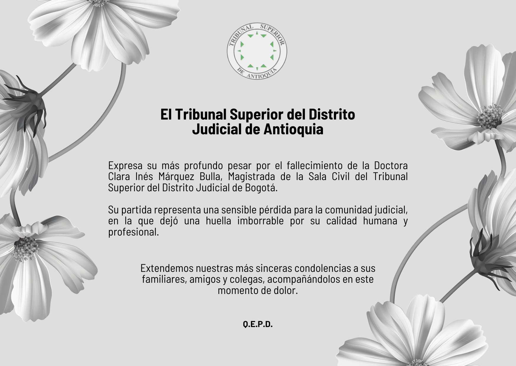 El Tribunal Superior del Distrito Judicial de Antioquia, lamenta profundamente el fallecimiento de la Doctora Clara Inés Márquez Bulla, Magistrada de la Sala Civil del Tribunal Superior del Distrito Judicial de Bogotá.